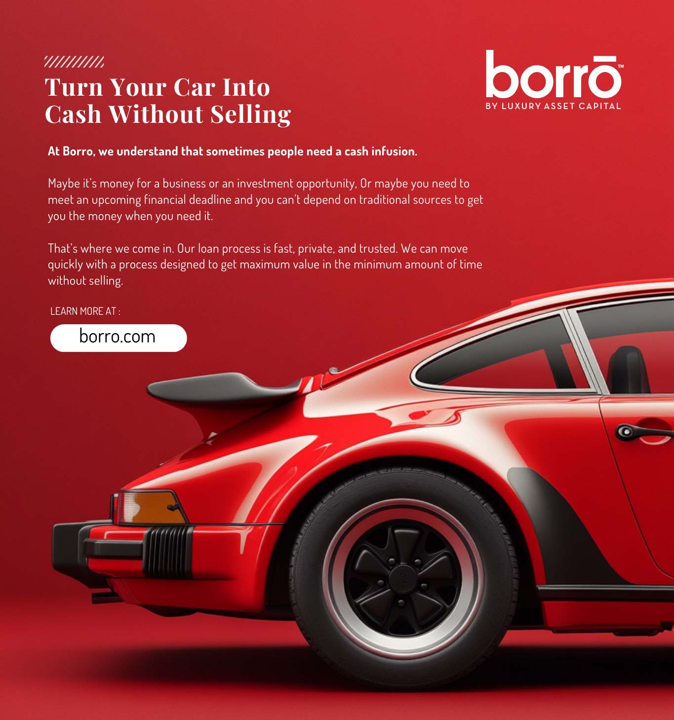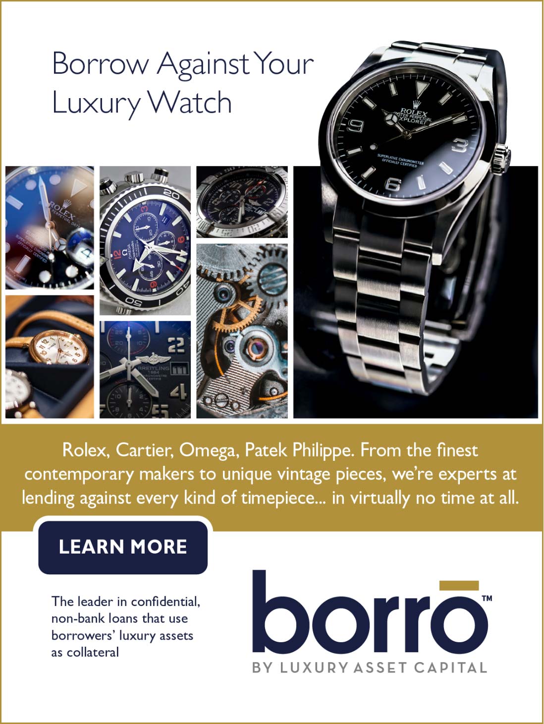 Borro, a Luxury Asset Capital brand, is the leader in confidential, non-bank loans that use the borrower’s luxury assets as collateral.